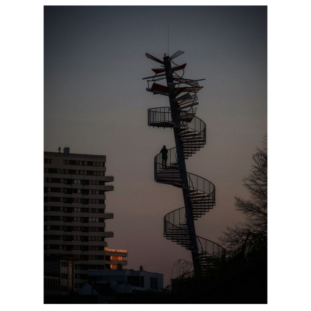 Der Berblinger Turm befindet sich oberhalb der Stadtmauer am Donauufer. Und wenn es dämmert, ist es möglich Bilder zu machen, die einer Silhouette vor einem Abendhimmel gleichen. Mit einem Teleobjektiv kann man aus nördlicher Position derartige Aufnahmen machen. Das Besondere am Berblinger Turm ist, dass er eine offene Konstruktion ist. Man sieht auf einen Blick wie viele Personen sich auf dem Turm befinden. Ich habe den Turm eine Weile beobachtet und einige Aufnahmen gemacht. Am besten gefällt mir die Aufnahme wie ein Einzelner einsam auf in der Mitte des Turms steht. Geht er rauf? Geht er runter? Ich weiß es nicht. Es gibt aber sicherlich auch andere Varianten, die interessant aussehen könnten.