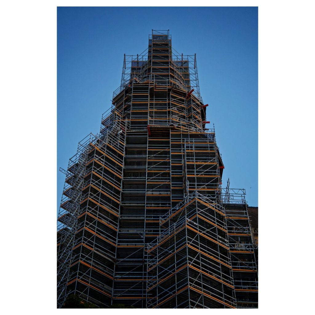 Das Gerüst versteckt den Nordturm so gut, dass selbst die Google Bildersuche derzeit (Stand 10/2025) im Bild nur die Kathedrale von Notre-Dame in Paris erkennen kann, die nach dem Brand wieder aufgebaut wurde und wurde und ebenfalls in ein umfassendes Gerüst gekleidet war. (Mich bestürzt schon die „Selbstsicherheit“ der Künstlichen Intelligenz und ihre völlig abwegige Analyse, es gibt viele Gerüste auf der Welt und nur wenige gehören nach Paris)