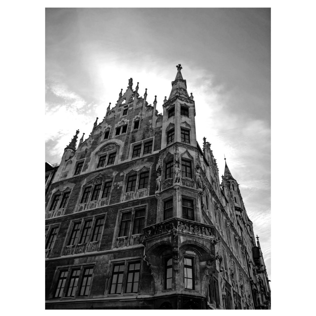In meinen Aufnahmen ging die Farbe des Himmels in einen Türkis-Ton über. Das geschah bei verschiedenen Bildern mit dem Smartphone und daher kam die Idee mit dem Umwandeln in schwarz und weiß. Ich denke, in Farbe wäre das Rathaus dennoch besser dran gewesen. An dem Tag spiegelte sich der blaue Himmel herrlich in den Fenstern.