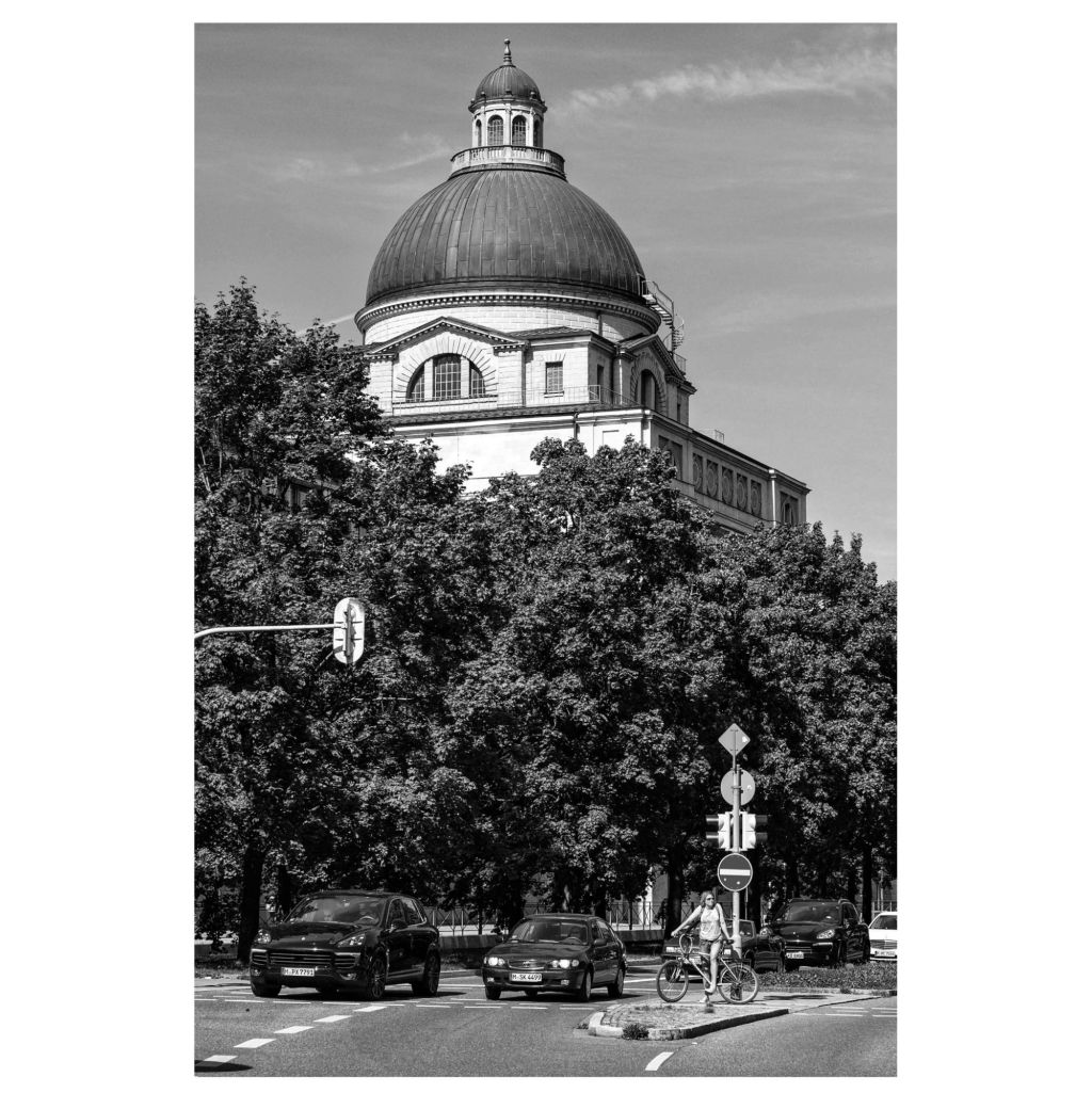 Das ist tatsächlich etwas deprimierend an Schwarz-Weiß, dass alle Blätter grau/dunkelgrau werden. Aber ich finde, die hell gekleidete Radfahrerin wird umso mehr hervorgehoben. Es gibt einen schönen Eindruck, wie hoch die Kuppel ist und wir groß das Gebäude ist. Wenn man nur die Kuppel auf das Bild bekommt, verliert man den Eindruck von ihrer Größe.