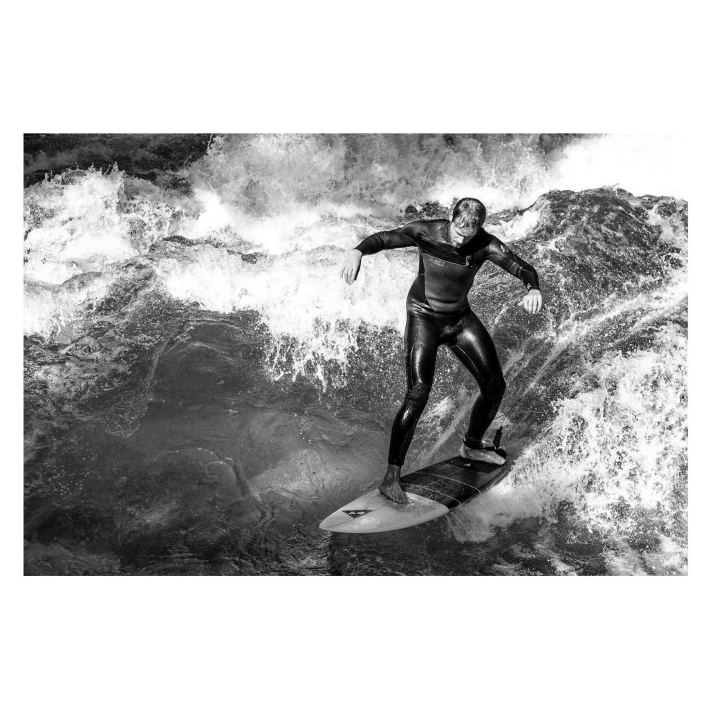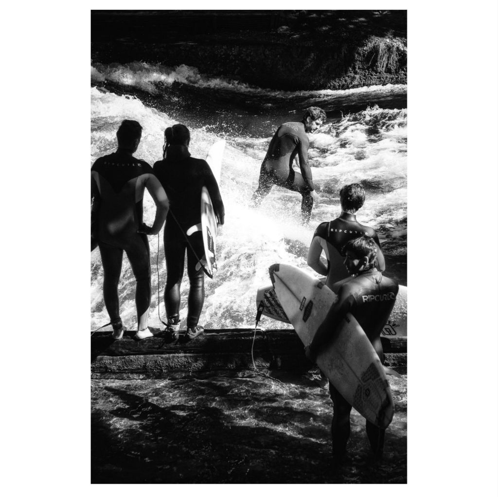 Mein persönliches Highlight war die Eisbachwelle mit den zugehörigen Surfern. Aber besonders da kommt es auch darauf an, welche Kleidung die Surfer tragen. Wenn sie zu helle Kleidung tragen, heben sie sich in schwarz-weißen Bildern nur mäßig von dem Wasser bzw. Wasserspiegelungen ab. Diese kleine Bilderreihe zeigt: Es lohnt sich, Bilder aus verschiedenen Perspektiven zu machen.
