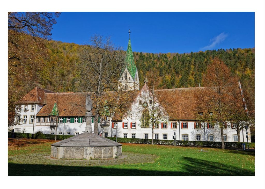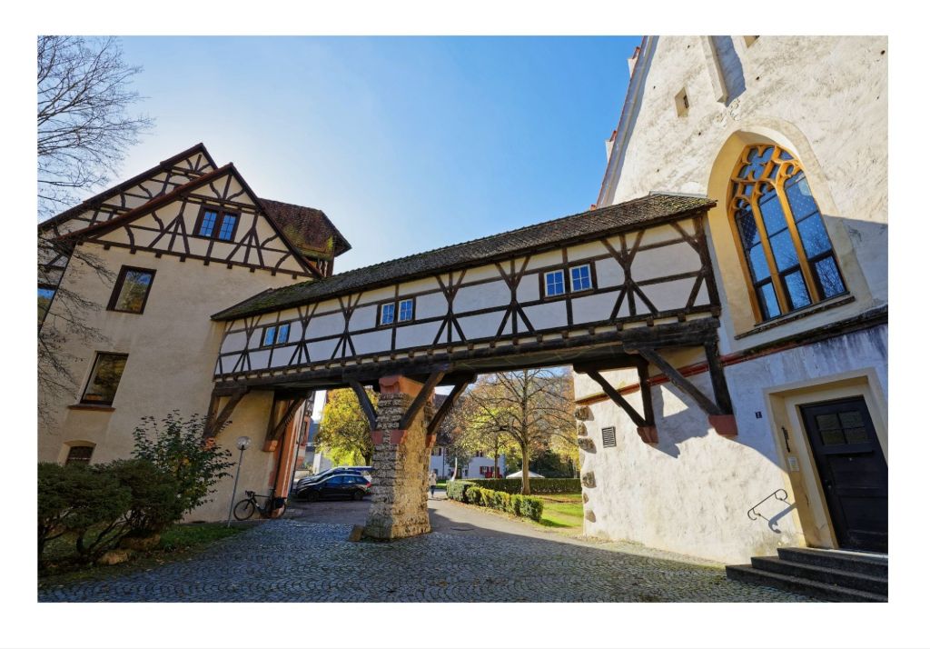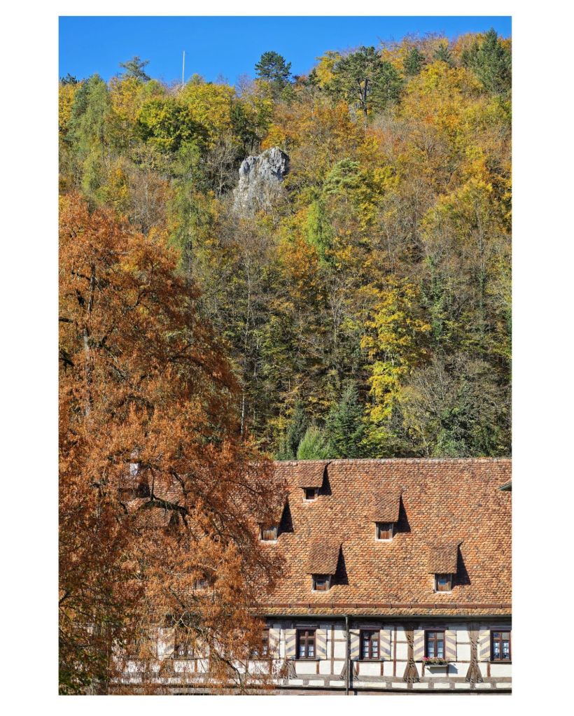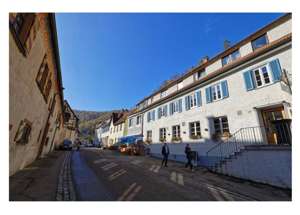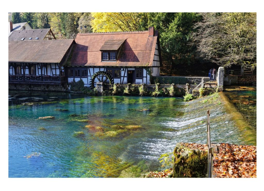 Die nahe Umgebung des Blautopfes kann mit einem Klostergelände punkten und mit Häusern in Fachwerkbauweise.